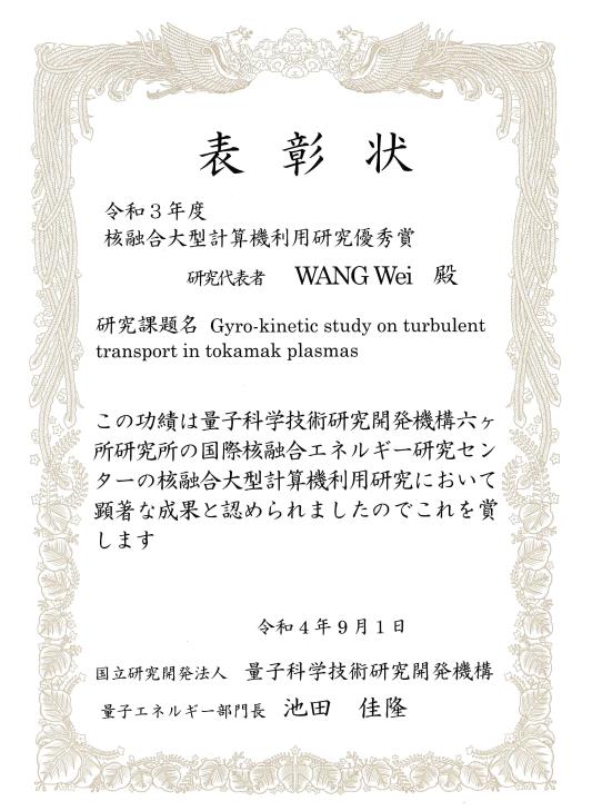 近日,由(日欧)国际聚变能源研究中心(IFERC:International Fusion Energy Research Centre)主导的超级计算机数值模拟项目(CSC:Computational Simulation Centre)颁发了2021~2022财年“杰出研究课题奖”(Award of Excellence use),以表彰该超算中心在年度运行中取得显著成绩的课题及其负责人。逐日团队培养的博士毕业生、现于核工业西南物理研究院工作的王玮副研究员获此殊荣。